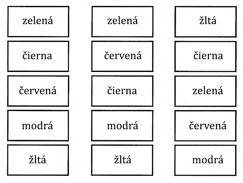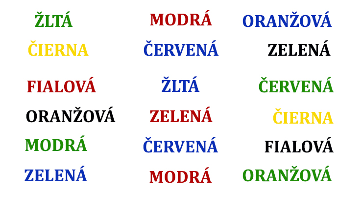 Pozrite sa na nasledujúci obrázok. Sú na ňom napísané slová, ktoré pomenúvajú farby. Pritom ale farba, ktorou sú napísané, je iná, ako je význam slova. Pozerajte sa na obrázok pozorne 1 minútu a skúste si zapamätať slová aj ich farby, ktorými sú napísané. Zatvorte obrázok a skúste farebnými ceruzkami napísať všetko, čo si pamätáte.