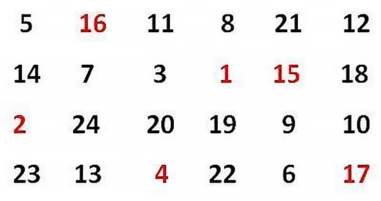 Ak máte aj 4 vodorovné riadky bez chyby, skúste si zapamätať dva krajné zvislé riadky na ľavej strane a napíšte ich. Potom si zapamätajte dva zvislé riadky v strede a nakoniec dva zvisle krajné riadky na pravej strane. Pamätajte, že niektoré čísla sú napísané červenou farbou.