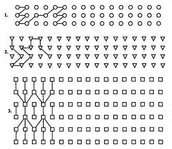 Začnime jednoduchým cvičením. Pozerajte sa jednú minútu na nasledujúci obrázok. Potom zatvorte tento obrázok a skúste nakresliť figúrky v rovnakom usporiadaní, ako ste videli na čistý papier.