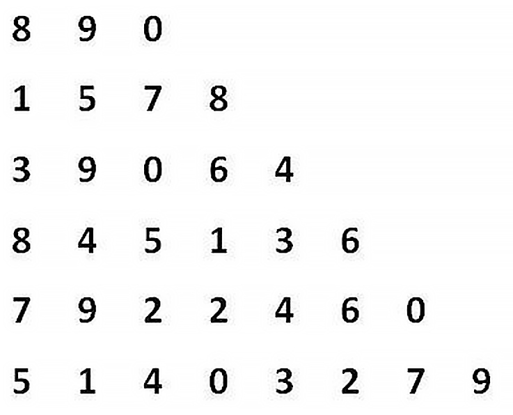 Pozrite sa na ďalšiu pyramídu čísel. V každom nasledujúcom riadku pod sebou je vždy jedna číslica pridaná navyše. Skúste si zapamätať nielen všetky čísla ale aj poradie v akom sú napísané. Zapamätajte si najprv prvý riadok, potom druhý riadok a tak postupne ďalej.