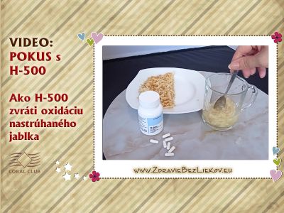 Video ukazuje, ako produkt H-500 dokáže spomaliť proces starnutia buniek, v tomto prípade oxidáciu nastrúhaného jablka. Rovnaký efekt má aj na naše bunky v tele. H-500 vytvára z bežnej vody tzv. "vodíkovú vodu" a zároveň tzv. "živú vodu".